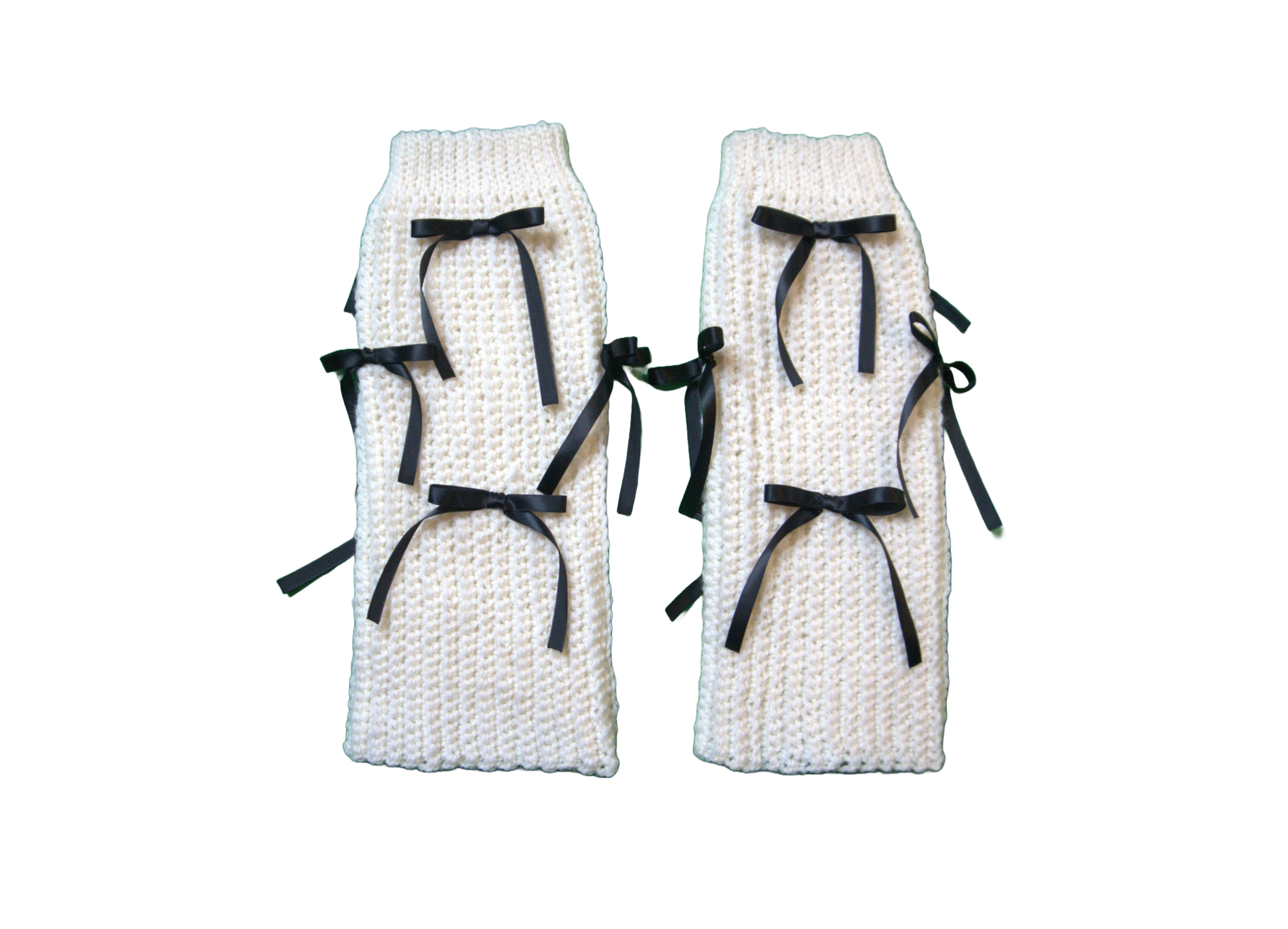 crocheted leg warmers with a ribbing on the top, decorated with bows.
